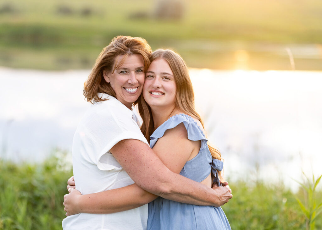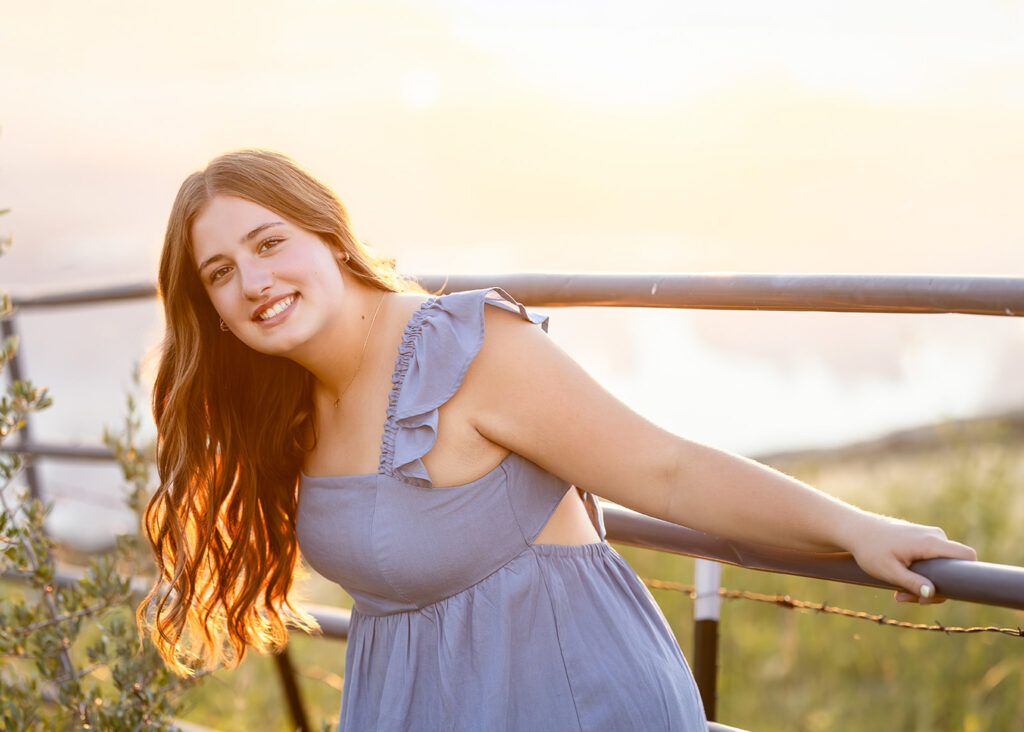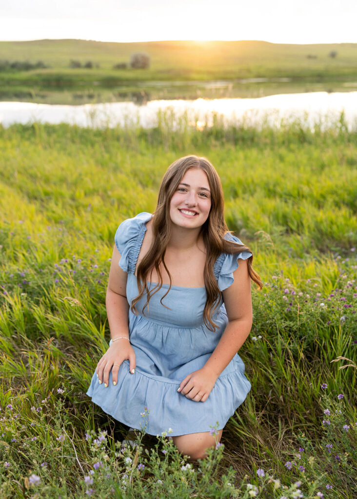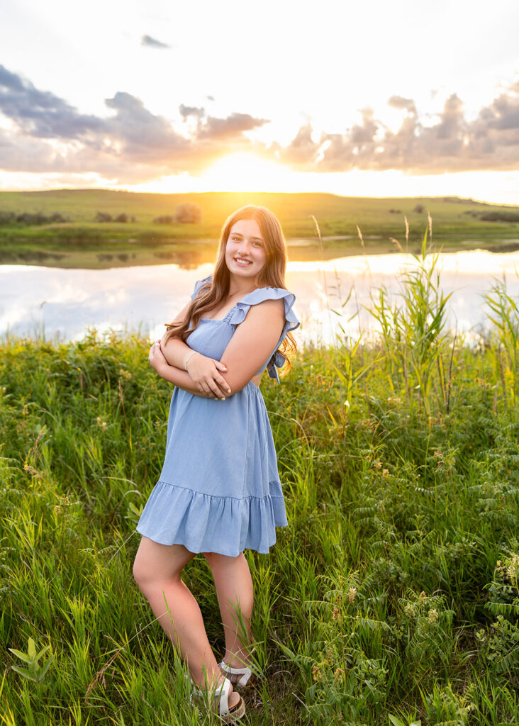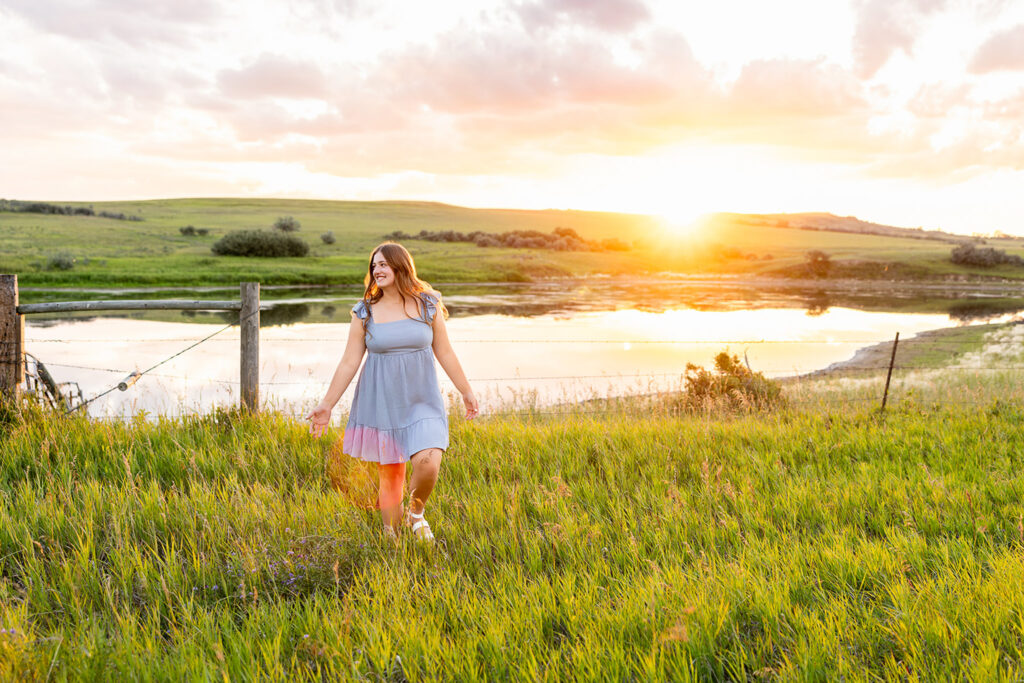 For the second half we headed to a dam on their farmland. The night was calm with no wind at all. The water sat smooth and still. Addison changed into a shorter blue dress and everything just clicked. Purple wildflowers framed parts of the area and a simple fence gave us another quiet moment to pause and create. It was one of those evenings that reminds me why I love being a Williston North Dakota senior photographer.