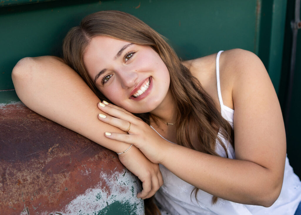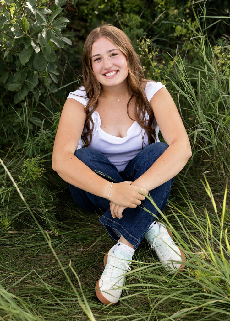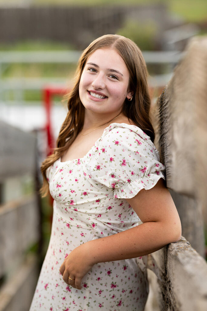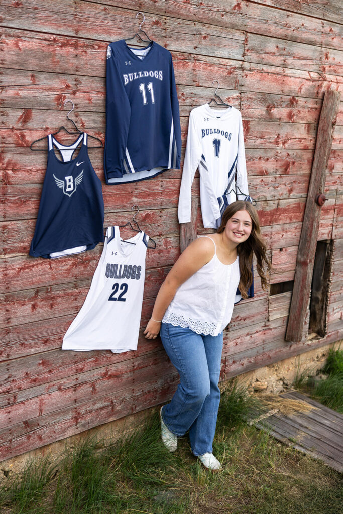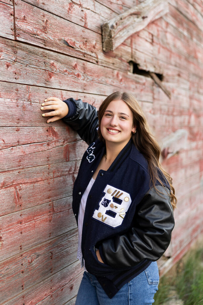 Once family photos were finished we headed to her grandparents farm. That is where Addison started her senior session wearing her letterman jacket with jeans and a white top. Her mom had hung Addison’s sports jerseys on an old wooden wall of one of the buildings so they could sit behind her in the photos. Confident and comfortable. It felt like the right way to open her senior session because it reflected who she is and where she has been. From there she changed into a long white dress and we leaned into the softness of the evening.
