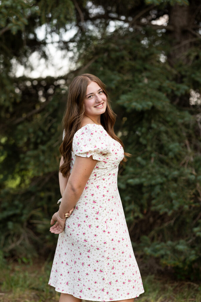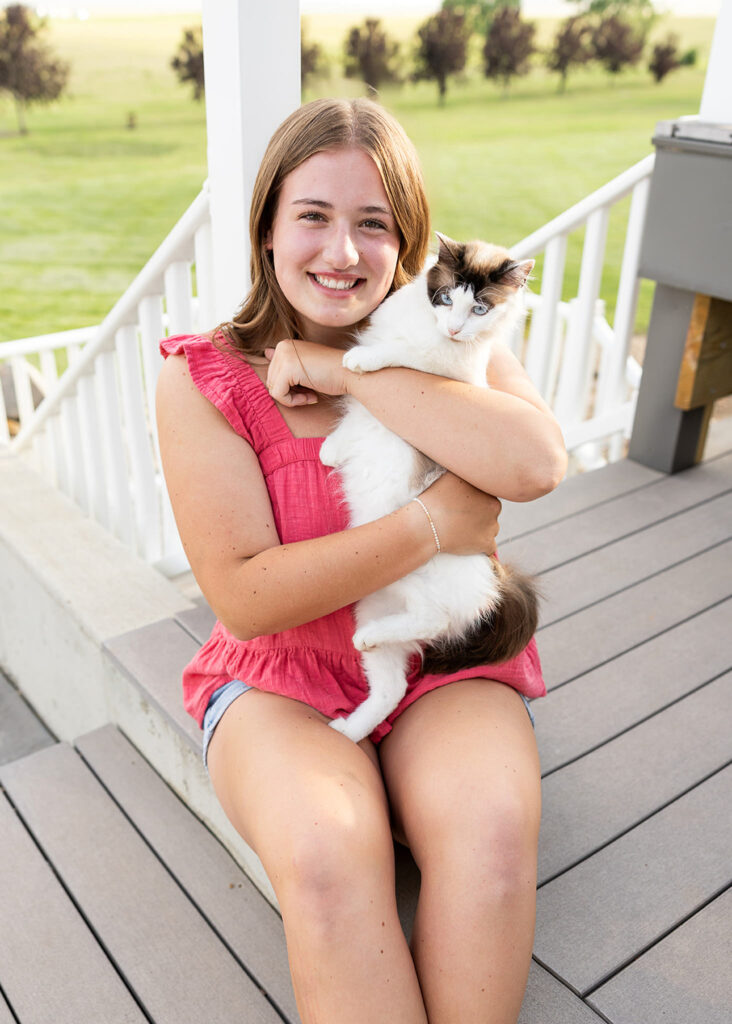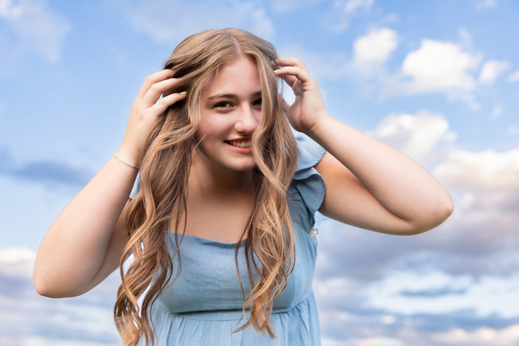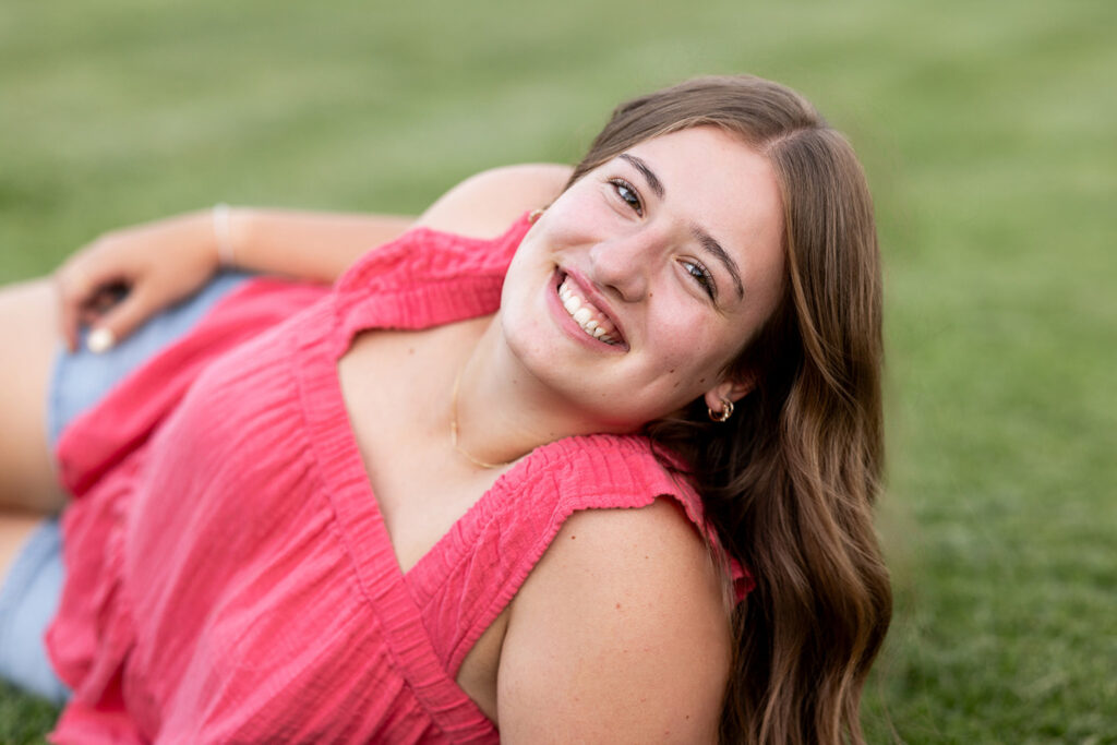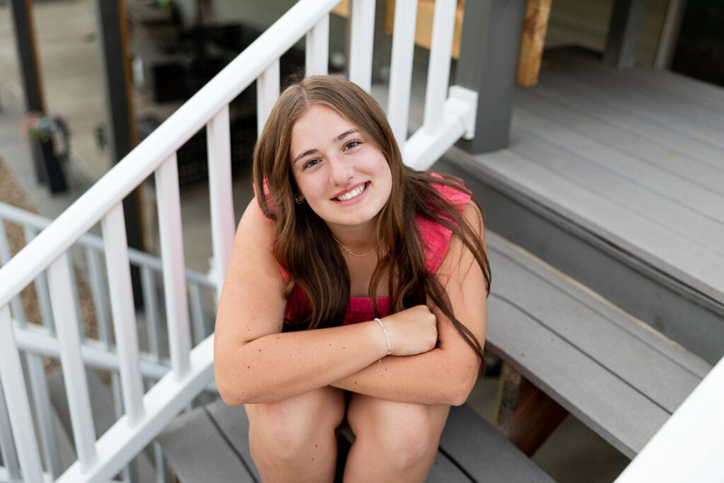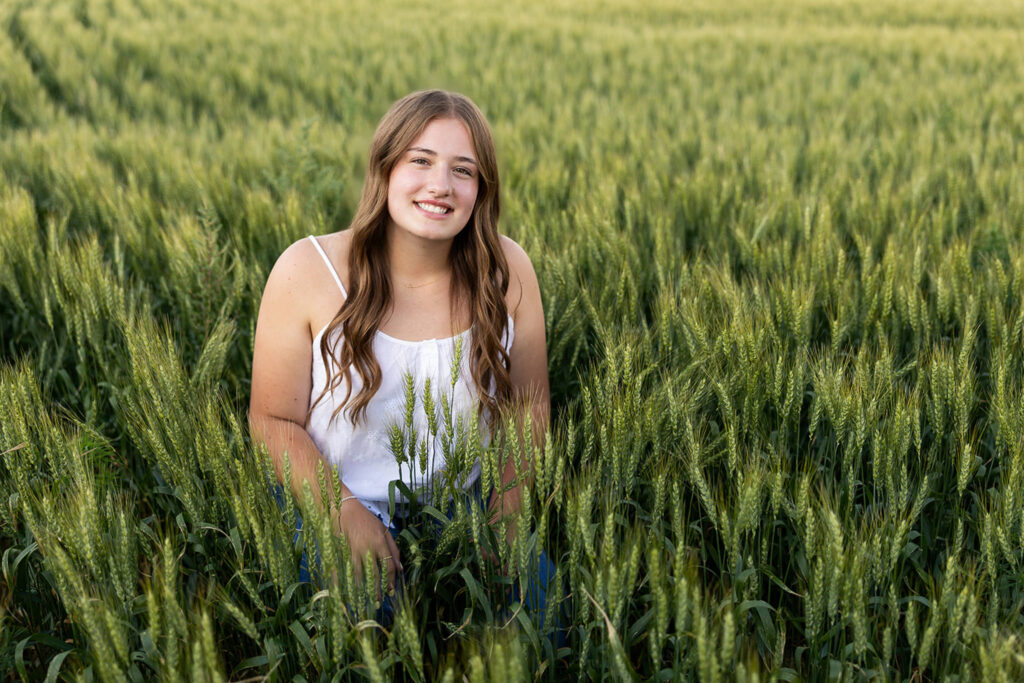 Once family photos were finished we headed to her grandparents farm. That is where Addison started her senior session wearing her letterman jacket with jeans and a white top. Her mom had hung Addison’s sports jerseys on an old wooden wall of one of the buildings so they could sit behind her in the photos. Confident and comfortable. It felt like the right way to open her senior session because it reflected who she is and where she has been. From there she changed into a long white dress and we leaned into the softness of the evening.