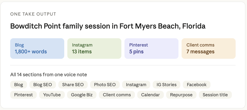How I Turned One Voice Note Into a Full Marketing Package for Every Session I used to finish a session, drive home with my head full of details and feelings about what just happened, and then lose all of it. Not the files. The story. The specific thing a mom said while her daughters walked […]