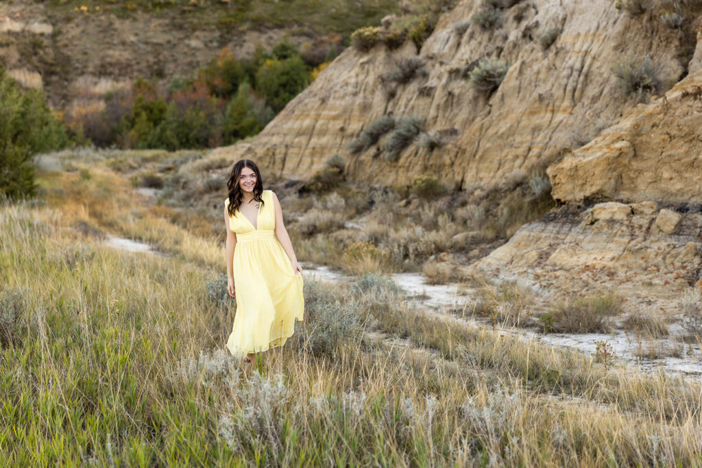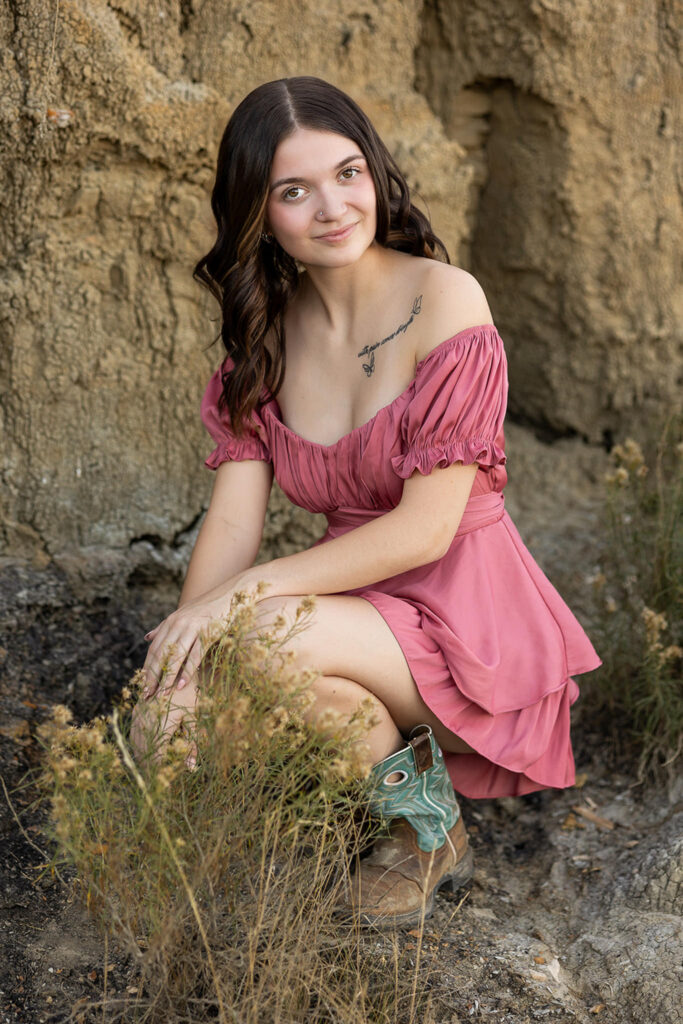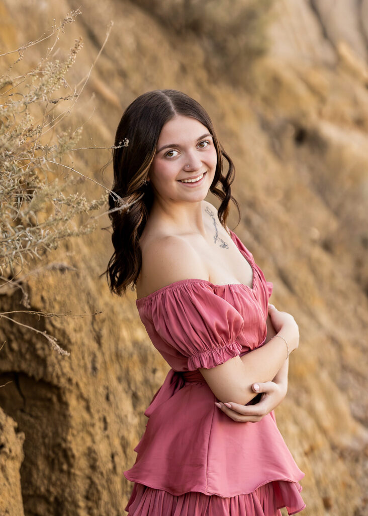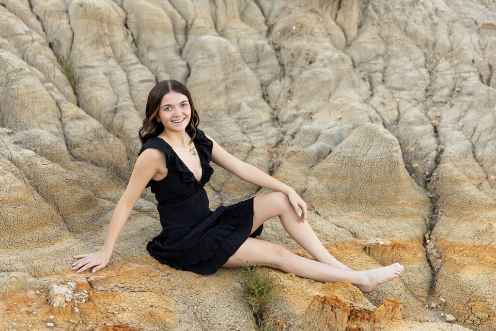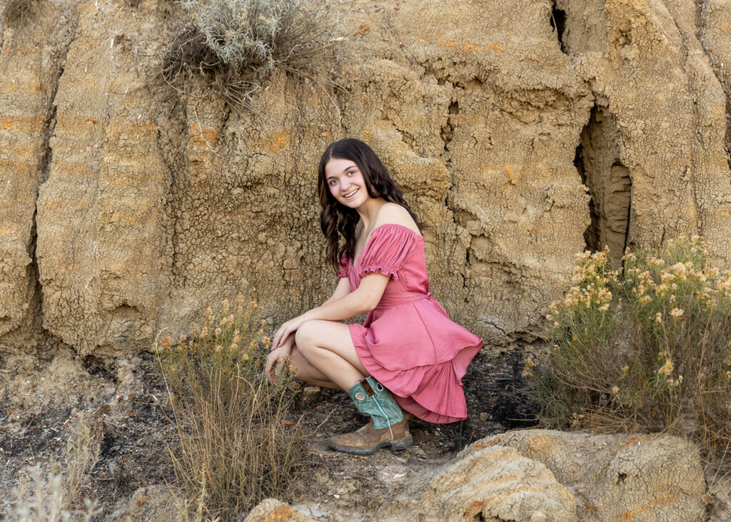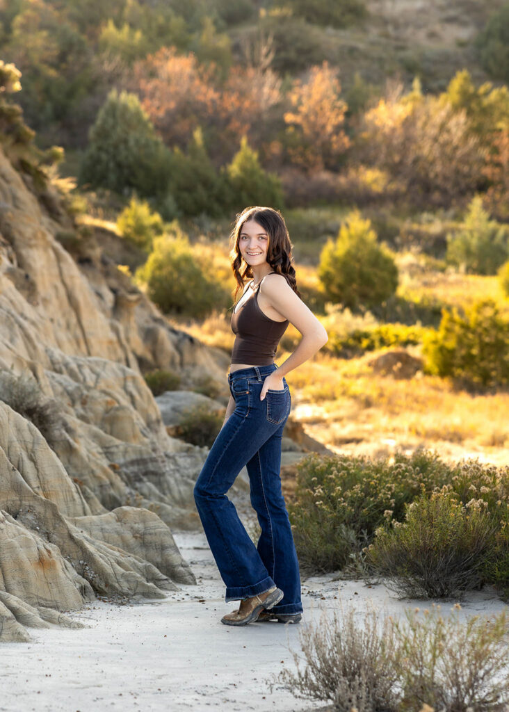 Danyn’s senior session started out at American Legion Park just outside of Williston, and it honestly felt like one of those nights you hope for all season. It was warm, about 86°, with no wind, and the golden fall light sat perfectly over the Badlands terrain. Right away, Danyn showed up ready to go, and within minutes, she was climbing, exploring, and completely in her element.