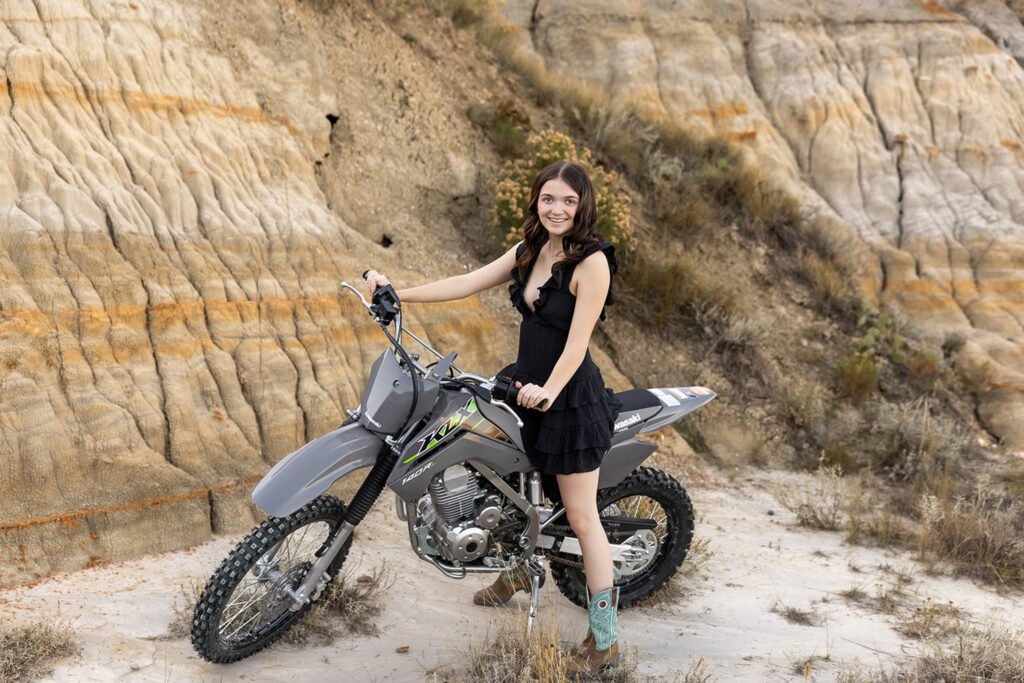 Her dad brought the dirt bike and stayed for Danyn’s entire senior session. At the same time, Jayme was right there the whole time, and Hadley kept everything moving behind the scenes. Since they had driven in from Dickinson and stayed with family the night before, it really felt like a full family effort just to make this night happen.