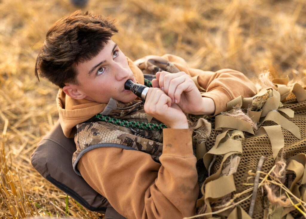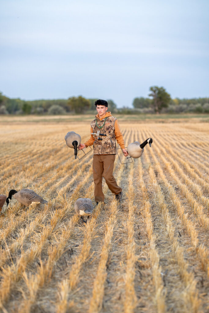 Out there, Eden brought pieces of his world with him. The geese decoys were set up, and we worked through a few setups around them. He had one of his hunting chairs and that camouflage blanket that basically makes him disappear.