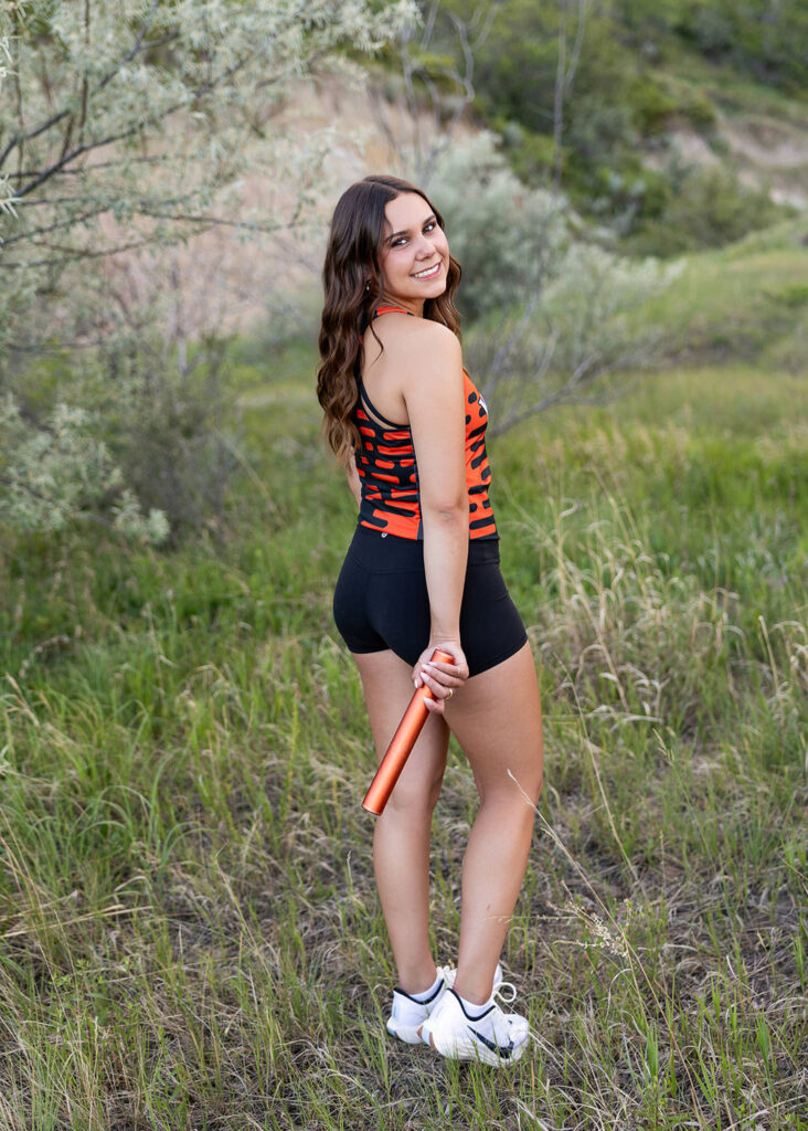 After downtown, we hit the road toward Lewis and Clark State Park. Somewhere along the way, Lainey changed into her track uniform in the car, and we made a quick roadside stop to grab some shots with her jerseys, spikes, baton, & hard-earned medals. The baton in this photo belonged to Terrille Jacobson’s dad, Terry — a huge supporter of local sports and someone who meant a lot to so many. Terrille has coached Lainey for years and is basically family, so while she was gathering Lainey’s jerseys for the shoot, she came across the baton while cleaning out her dad’s house. She thought Lainey might want to use it as a prop.