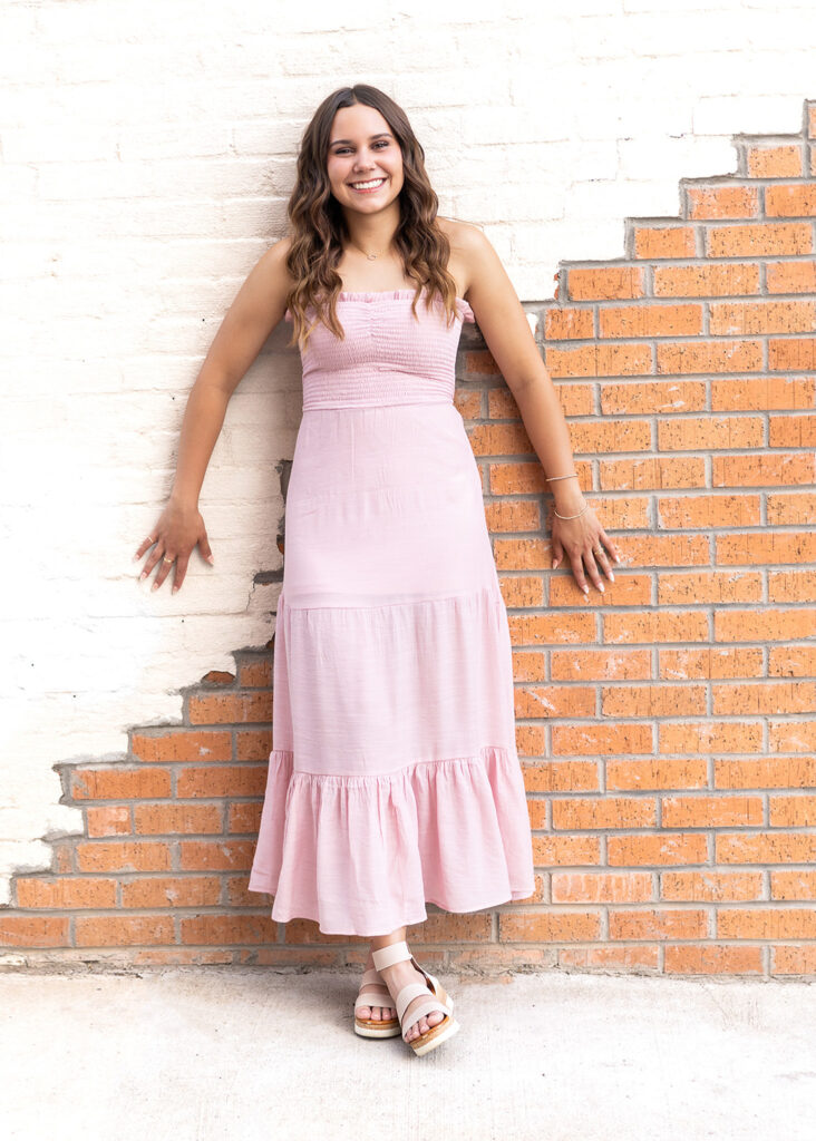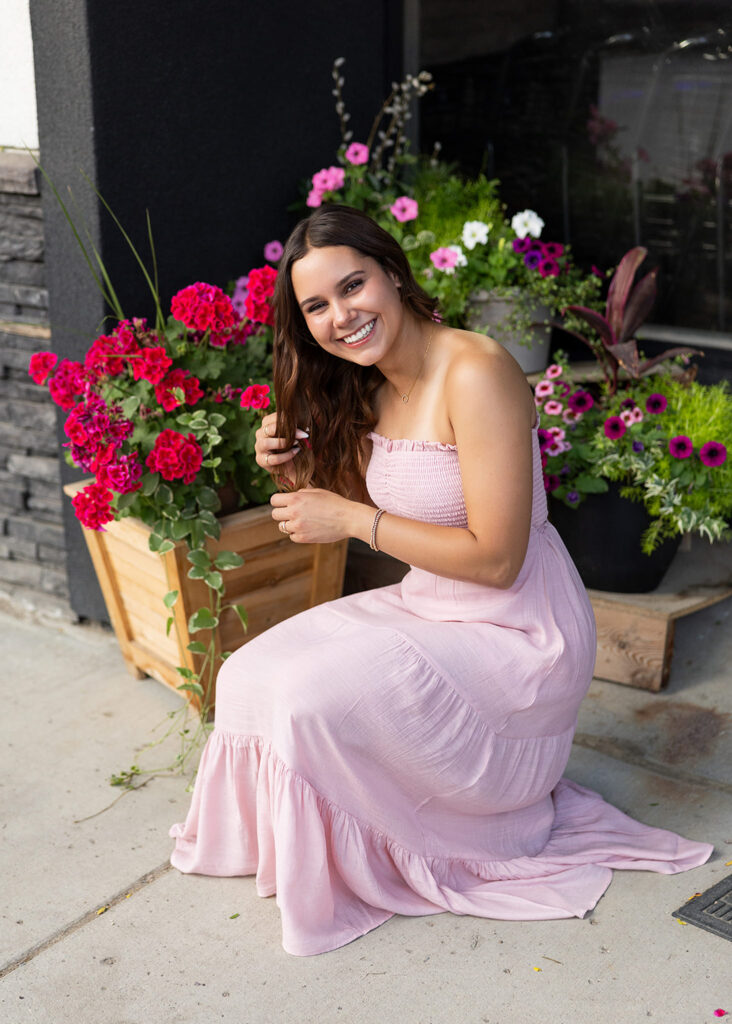After warming up, she changed into a long pink dress. We found flowers tucked along the sidewalks and a clean white wall that made the color pop.